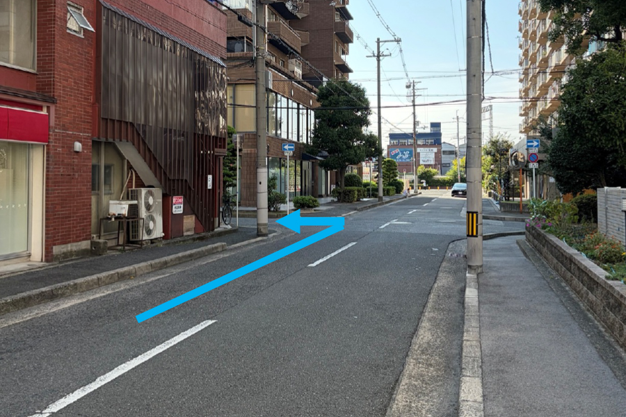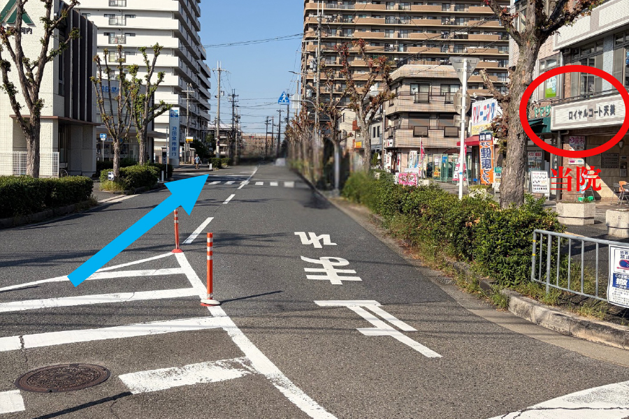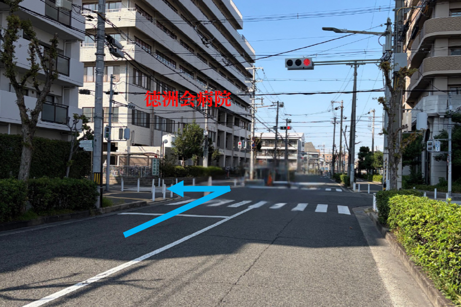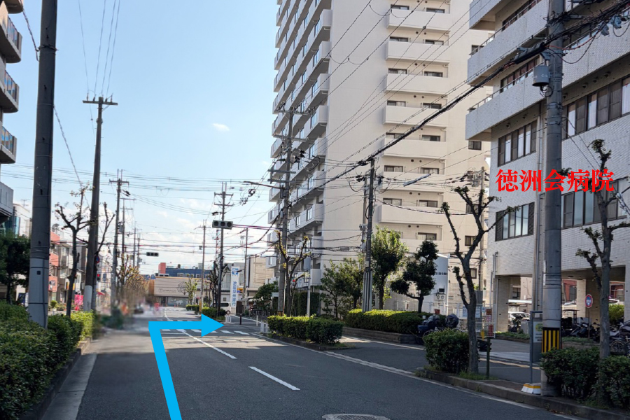 2.直進すると徳洲会病院が見えてますので、その角を左折します。
